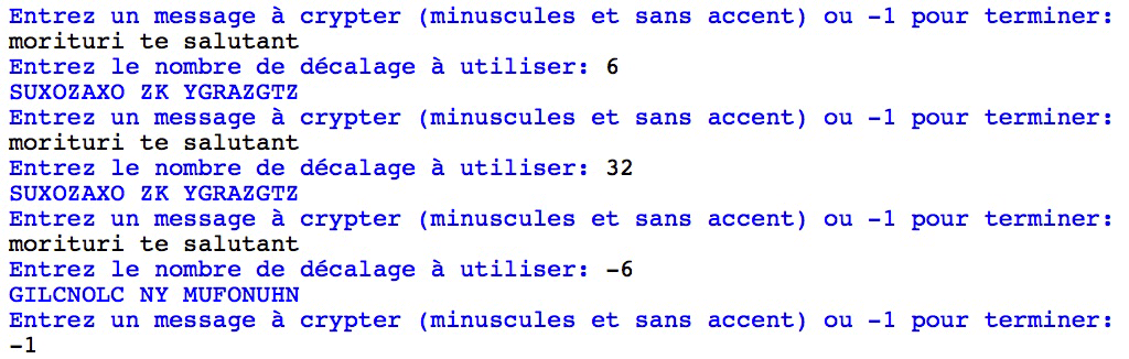 Le chiffre de César est une méthode de cryptage qui consiste à cacher un message en décalant chacune des lettres de l'alphabet de quelques crans vers la droite. Par exemple, en décalant tout l'alphabet de 6 crans, le message "ave caesar morituri te salutant" devient "GBK IGKYGX SUXOZAXO ZK YGRAZGTZ". Cette méthode de chiffrement peut être automatisée au travers d'un programme qui suit le déroulement suivant: