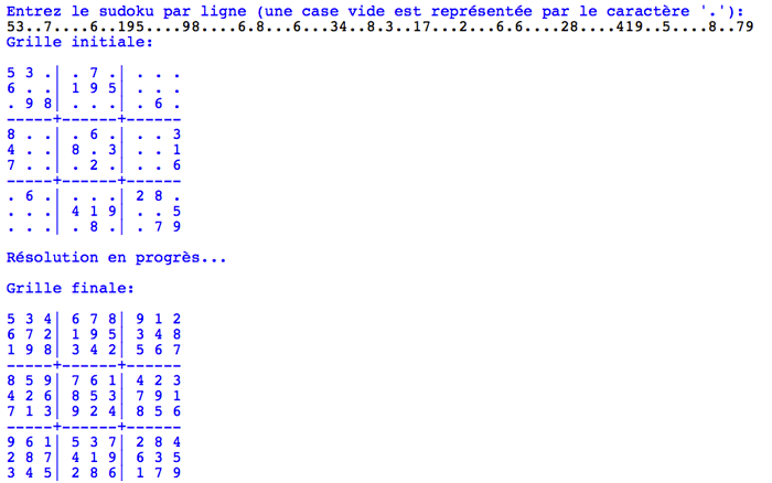position correspond à 81, la résolution est terminée et la fonction retourne TRUE, sinon elle calcule l'indice i de la ligne et j de la colonne correspondant à position (par exemple, position = 22 se transforme en i = 2 et j = 4);position de 1;solver retourne TRUE. En cas d'échec, la cellule traitée est remise à zéro à l'aide du caractère "." et la fonction solver retourne FALSE.