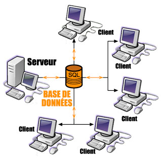 Les clients sont reliés au serveur par divers procédés et protocoles (éventuellement par l'intermédiaire d'Internet). Chacun d'entre eux peut accéder à une partie plus ou moins importante des données, avec autorisation ou non de modifier certaines d'entre elles, d'en ajouter ou d'en supprimer, en fonction de règles d'accès bien déterminées, définies par un administrateur de la base de données.