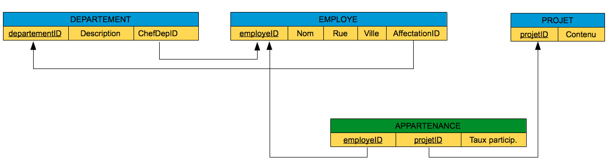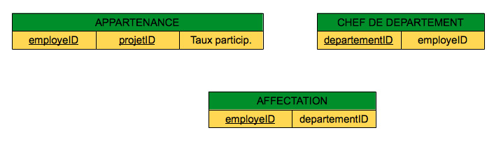Etant donné que chaque département est dirigé par un seul chef, le numéro de département departementID suffit pour former la clé primaire de la table CHEF DE DEPARTEMENT. De même, le numéro d'employé employeID suffit pour définir la clé d'identification de la table AFFECTATION, car chaque employé est affecté à un seul département. Néanmoins, la clé d'identification de la table APPARTENANCE doit être formée par la concaténation de deux clés étrangères: le numéro d'employé et le numéro de projet. En effet, un employé peut participer à plusieurs projets et, inversement, un projet peut impliquer plusieurs employés.