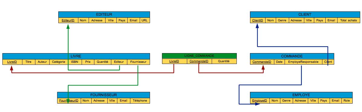 Une clé étrangère dans une table est un attribut qui sert de clé primaire dans une autre table et permet d'établir les liens désirés entre les tables en question.