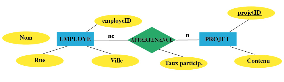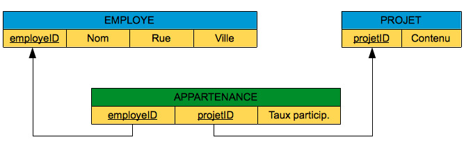 Dans l'exemple ci-dessus, nous avons créé une table pour l'ensemble de liens APPARTENANCE. Cette table utilise les clés primaires des tables EMPLOYE et PROJET comme clés étrangères et contient un autre attribut appelé Taux participation qui indique le degré d'appartenance d'un employé à un projet en pour-cent. La clé primaire de la table APPARTENANCE est formée par la concaténation des clés étrangères: le numéro d'employé et le numéro de projet. En effet, un employé peut participer à plusieurs projets et, inversement, un projet peut impliquer plusieurs employés.