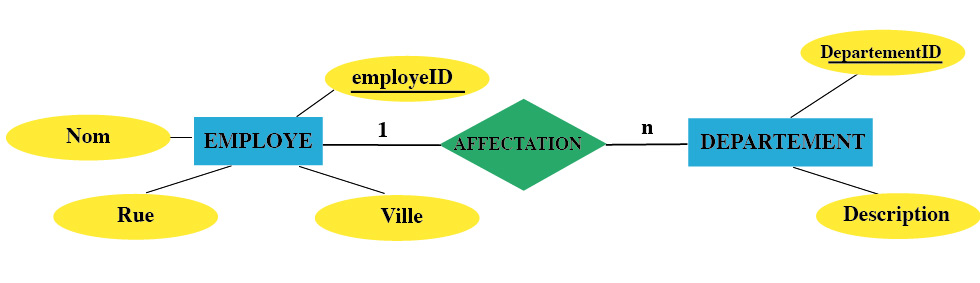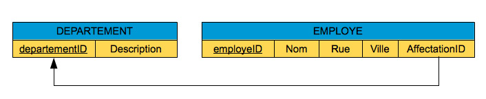 Dans l'exemple ci-dessus, pour exprimer les liens qu'il existe entre les départements et les employés de l'entreprise, nous avons ajouté à la table EMPLOYE une clé étrangère AffectationID. Pour chaque employé, la valeur de cette clé indique le numéro du département auquel il est affecté. La liaison établie par la clé étrangère est définie par un attribut dont le nom se compose de son rôle dans la liaison.