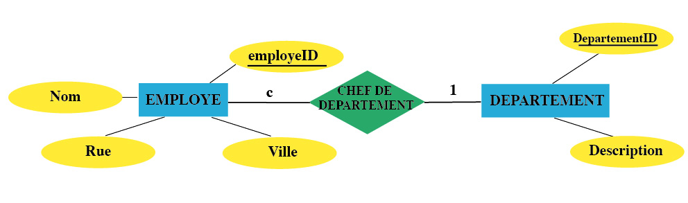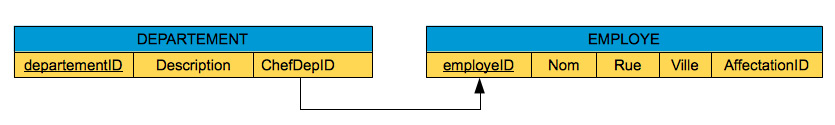 Dans l'exemple ci-dessus, nous complétons la table DEPARTEMENT par le numéro d'employé du chef de département. Ainsi, l'ensemble de liens CHEF DE DEPARTEMENT s'exprime à travers l'attribut ChefDepID. Chaque valeur de cette clé étrangère identifie un employé dans le rôle de chef de département.
