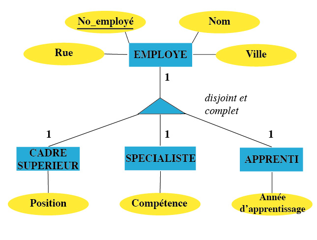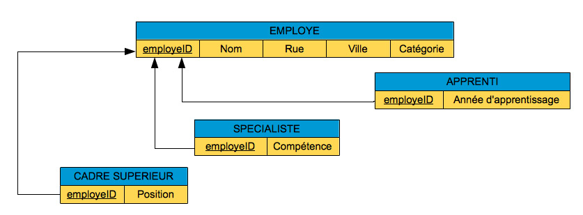 Dans l'exemple ci-dessus, les données concernant les employés forment une hiérarchie de spécialisation qui nous amène à créer quatre tables EMPLOYE, CADRE SUPERIEUR, SPECIALISTE et APPRENTI. Nous devons définir la même clé d'identification employeID pour toutes les tables subordonnées à la table EMPLOYE. Sachant qu'un employé particulier ne peut appartenir simultanément à plusieurs cartégories, nous introduisons l'attribut Catégorie dont les valeurs sont «Cadre supérieur», «Spécialiste» et «Apprenti». Par cette méthode, nous garantissons la propriété d'une hiérarchie de généralisation disjointe: l'intersection des ensembles spécialisés est vide. La propriété de complétude ne peut pas s'exprimer