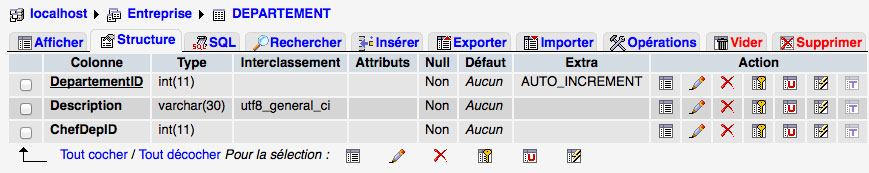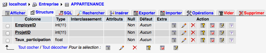 En vous basant sur le schéma relationnel ci-dessous de la base de données Entreprise, créez les tables PROJET, DEPARTEMENT et AFFECTATION à l'aide de phpMyAdmin en attribuant à chaque table ses attributs avec leur type et en déclarant correctement les clés primaires de chaque table.