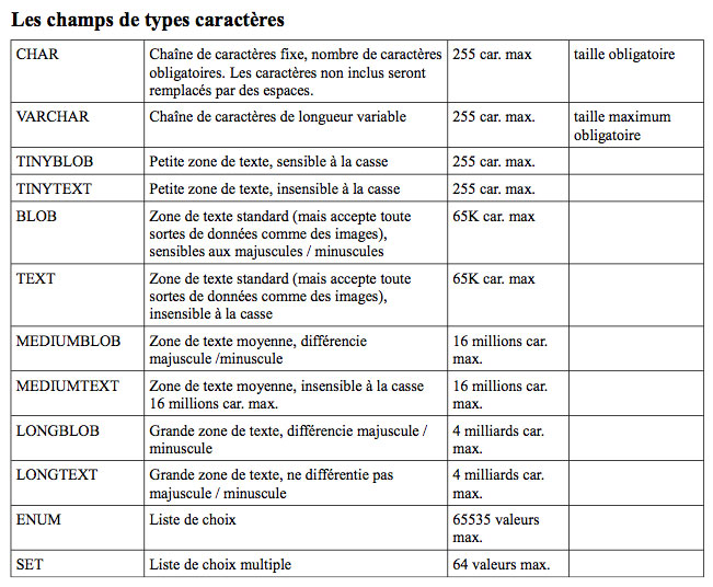 VARCHAR notamment, afin de limiter le nombre de caractères autorisés.
