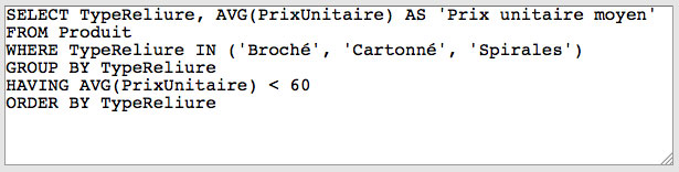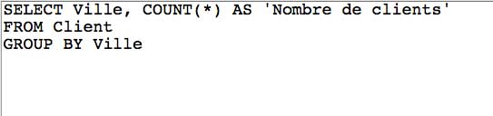 Afin d'obtenir une telle table de résultats, produit d'une opération de regroupement et d'une opération d'agrégation, il suffit de rédiger et de faire exécuter la requête SQL suivante: