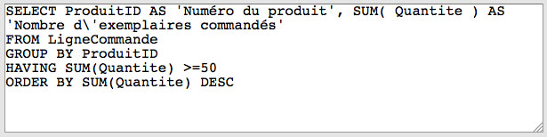 Cette requête n'est cependant pas acceptée par le SGBD qui retourne un message d'erreur. Cette erreur provient du fait que la clause WHERE permet de sélectionner (filtrer) des lignes individuellement et non les lignes résultant d'agrégation. Fort heureusement, une autre clause conditionnelle permet de dépasser cette limite: la clause HAVING. Cette dernière permet de sélectionner parmi les lignes agrégée générée par l'exécution de la clause GROUP BY celles répondant à une ou plusieurs conditions données. Au lieu d'identifier des lignes, HAVING identifie les groupes qui satisfont à un critère de sélection donné: