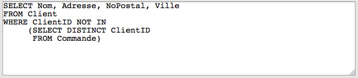 Comme l'exige la syntaxe, la liste de sélection dans la sous-requête ci-dessus contient un seul attribut, à savoir ClientID, dont les valeurs seront utilisées dans la clause WHERE de la requête externe. Nous utilisons l'option DISTINCT dans la clause SELECT car nous ne nous intéressons pas au nombre de commandes passées par un client quelconque mais uniquement aux clients ayant passé au moins une commande. Pour chaque client dans Commande, la sous-requête doit extraire son ClientID une seule fois quel que soit le nombre de commandes qu'il a passées.