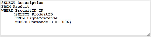 La technique des sous-requêtes est applicable dans cet exemple car la valeur de CommandeID n'apparaît pas dans le résultat final mais uniquement comme critère de sélection dans la requête interne. Si la requête consistait à récupérer le nom, l'adresse et le numéro de commande du client qui a passé la commande 1008, la technique des sous-requêtes n'aurait pas pu être appliquée. En effet, les données d'une sous-requête ne peuvent pas être incluses dans le résultat final.