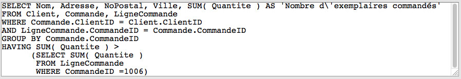 Une sous-requête produit un résultat qui doit être comparé à UN attribut tel que ClientID. Par conséquent, la clause SELECT de la sous-requête doit spécifier UN seul attribut comme le montre l'exemple suivant: