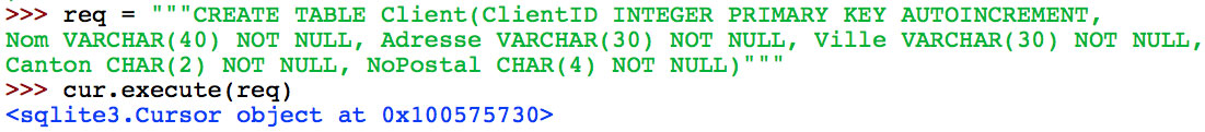 La requête est exprimée dans une chaîne de caractères classique, que nous transmettons au curseur par l’intermédiaire de sa méthode execute(). Rappelons au passage que le langage SQL ne tient aucun compte de la casse des caractères : vous pouvez donc encoder vos requêtes SQL indifféremment en majuscules ou en minuscules. Nous avons personnellement choisi d’écrire en majuscules les instructions de ce langage, afin de bien marquer la différence avec les instructions Python environnantes, mais vous pouvez bien évidemment adopter d’autres habitudes.