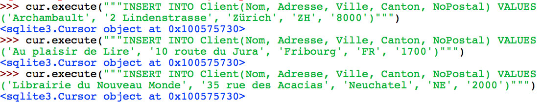 Une fois la connexion établie et le curseur créé, il est possible d'adresser des requêtes SQL au moteur de base de données SQLite par l'intermédiaire du curseur.