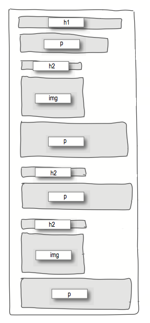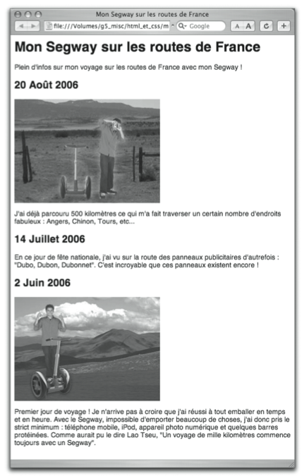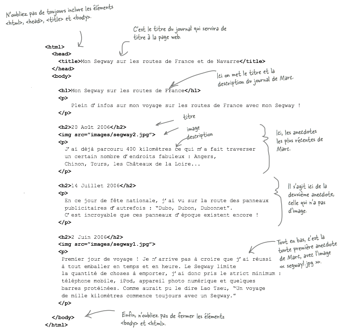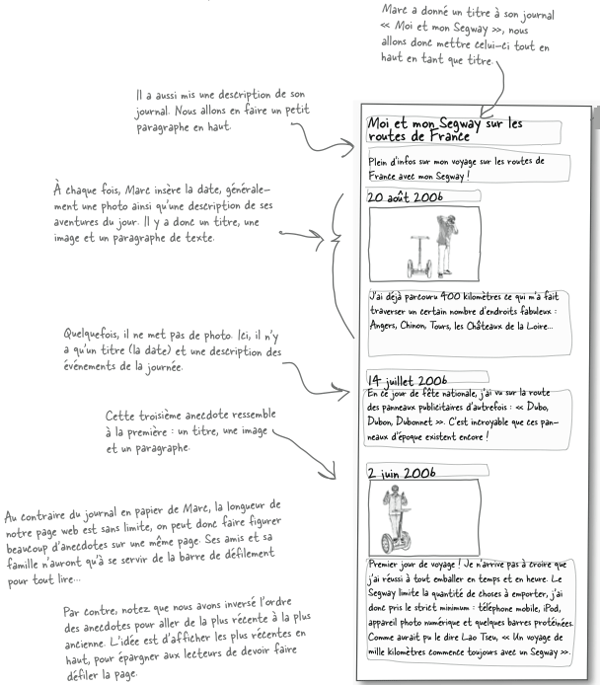 Marc passe son temps sur son Segway à parcourir les routes de France et de Navarre. Afin de garder une trace de son expérience, il décide de raconter son voyage dans un journal qu'il aimerait bien publier sur le Web afin d'en faire profiter toute sa famille et ses amis. Par chance, son journal ressemble beaucoup à une page Web: chaque journée relatée par Marc comporte une date, une photo et l'anecdote du jour. Il est par conséquent assez aisé de transformer l'ébauche de la page ci-dessous à gauche à la façon d'un plan pour une page HTML comme le prouve l'image ci-dessous à droite: