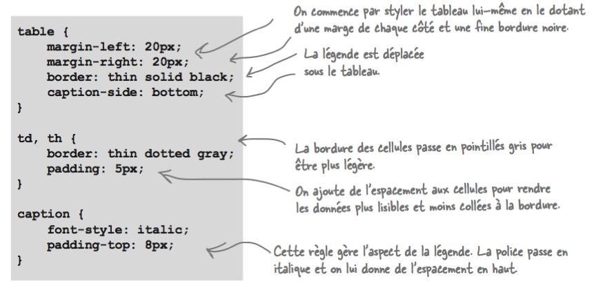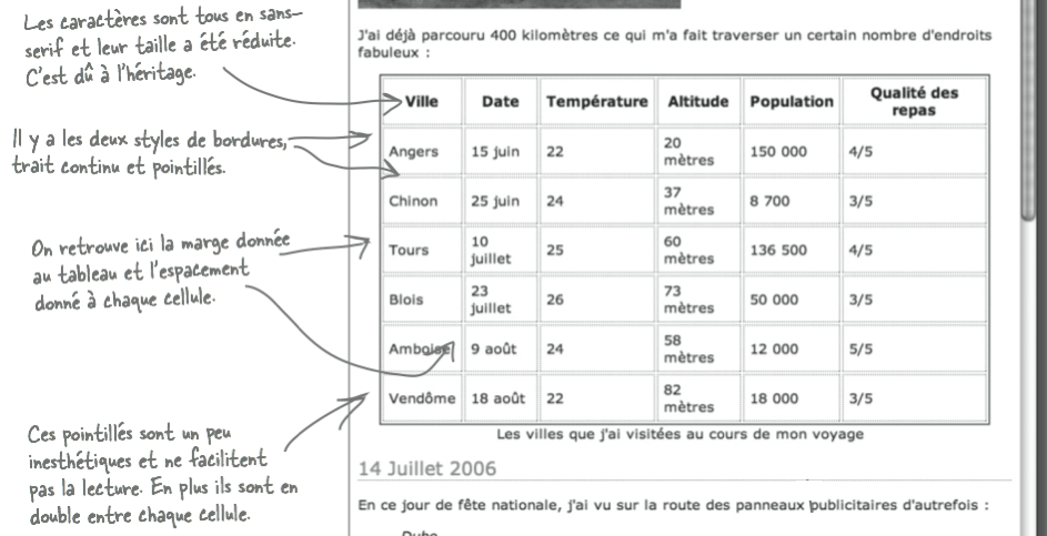 Avant d'attaquer le positionnement et la mise en page d'éléments grâce aux CSS, étudions comment tirer parti de nos nouvelles connaissances pour styler un tableau. Pour y parvenir, nous nous pencherons sur le site de Marc (téléchargeable ici) pour lequel nous avions déjà réalisé un tableau complexe que nous avions omis de mettre en forme. A ce dessein, ajoutez la partie sélectionnée ci-dessous dans le fichier journal.css puis visualiser le résultat dans votre navigateur: