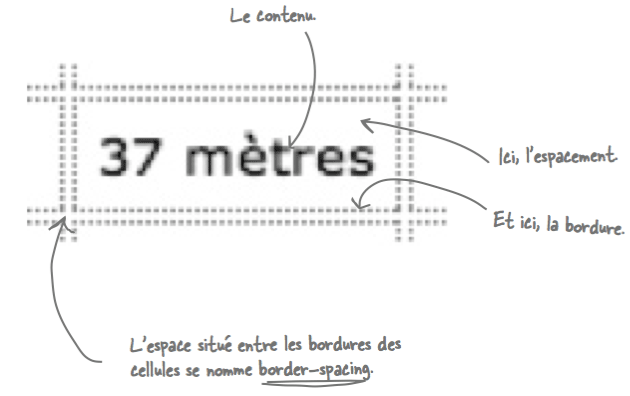 Comme nous pouvons le constater avec l'exemple ci-dessus, les cellules du tableau sont calquées sur le modèle de boîte: elles possèdent des espacements et des bordures. Par contre, pour les marges, il y a une grande différence. Les cellules n'ont pas de marge, elles ont un certain espace autour de leur contour et cet espace vaut pour le tableau tout entier. L'espace situé entre les bordures des cellules se nomme border-spacing et est définie pour l'ensemble du tableau. Outre l'utilisation de la propriété border-spacing, il est possible de résoudre autrement les bordures. La propriété CSS border-collapse fusionne les bordures de façon à supprimer l'espace qui les sépare. Le navigateur ignore par conséquent tout l'espace de bordure donné au tableau.