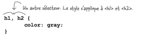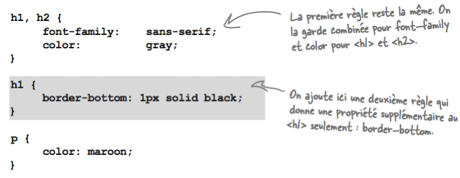 Pour mettre en valeur le titre de bienvenue, nous pourrions le souligner à l'aide de la propriété border-bottom. Néanmoins, en affectant cette propriété à la règle qui combine les éléments <h1> et <h2>, les deux titres seront soulignés. Pour limiter cette bordure uniquement à l'élément <h1>, il suffit d'ajouter une nouvelle règle qui ne concerne que cet élément: