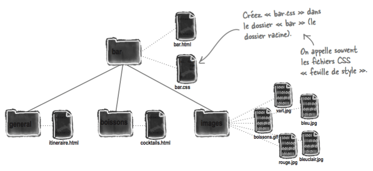 La page bar.html commence à avoir du style. Il serait bien de pouvoir appliquer le même style aux pages cocktails.html et itineraire.html afin d'avoir une certaine ligne graphique pour le site entier. En copiant l'élément <style> avec l'ensemble des règles dans chaque fichier, il faudra systématiquement modifier chacun des fichiers en cas de changement de style. Il existe une meilleure façon de faire: enregistrer l'ensemble des règles CSS du site dans un fichier externe bar.css que nous vous invitons à créer.