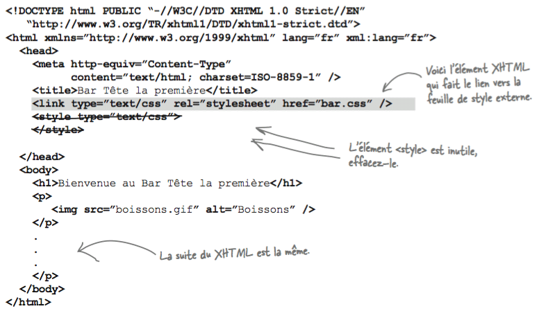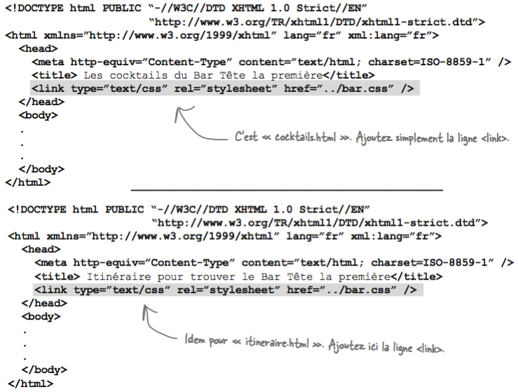 Il suffit ensuite d'informer le navigateur qu'il doit styler chaque page conformément à la feuille externe. Ceci est possible grâce à l'élément <link> comme le suggèrent les exemples ci-dessous: