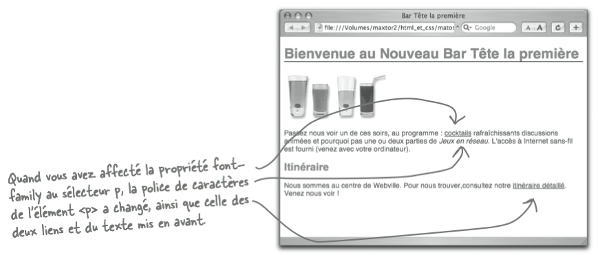 Avez-vous remarqué qu'en assignant la propriété font-family au sélecteur p, celle-ci a aussi affecté tous les éléments à l'intérieur de <p>, comme <a> ou <em> ? De manière générale, les éléments imbriqués dans un conteneur héritent des propriétés de ce dernier même si aucun style ne leur est pas explicitement appliqué.