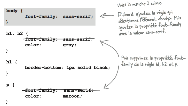 Ainsi, en remontant la propriété font-family au niveau de l'élément <body>, nous pouvons modifier la police de caractères sur toutes les pages du site. Tout élément ajouté à partir de maintenant héritera donc automatiquement d'une police sans-serif.