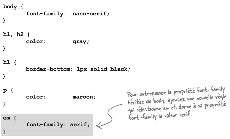 Quand la propriété font-family est au niveau de l'élément <body>, le style des polices de toutes les pages est affecté. Néanmoins, si vous voulez que vos élément <em> utilisent une police serif, il vous est possible d'outrepasser l'héritage en donnant à cet élément une règle spécifique comme ci-dessous. En effet, avec les CSS, ce sont toujours les règles spécifiques qui ont la prédominance sur celles héritées.