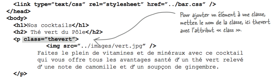 Une règle avec un sélecteur p applique le même style à tous les éléments <p>. Il est néanmoins possible d'ajouter un style particulier différent à chaque paragraphe en lui ajoutant un attribut class. Ceci permettra, par exemple, de styler chaque paragraphe du fichier cocktail.html à l'aide d'une couleur différente de telle sorte que la couleur du texte corresponde à la couleur de la boisson. Ainsi, pour faire passer en vert le paragraphe «Thé vert du Pôle» du fichier cocktails.html, il suffit d'ajouter l'élément <p> à une classe nommée thevert dont nous définissons le style dans la feuille bar.css:
