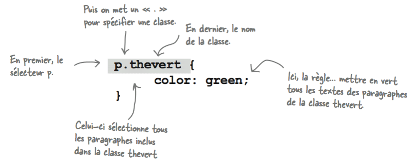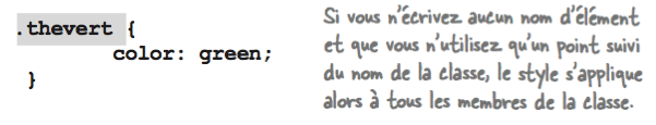 Vous venez d'écrire une règle qui se sert de la classe thevert pour mettre en vert tous les paragraphes appartenant à cette classe. Pour styler d'autres éléments de la classe thevert, la règle s'écrit tout simplement avec un point devant le sélecteur. Cette règle aura pour effet d'afficher tous les éléments de la classe thevert en vert quelque soit leur type: