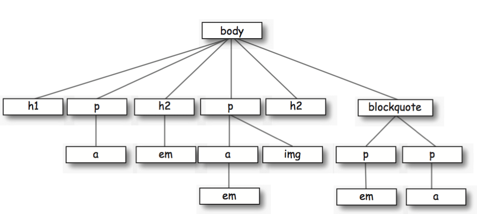 Savoir utiliser les sélecteurs est la première étape pour maîtriser les CSS. Pour sélectionner les éléments à styler, il est impératif de pouvoir bien se représenter mentalement les relations qu'il existe entre les différents éléments du XHTML à l'aide du diagramme des éléments:
