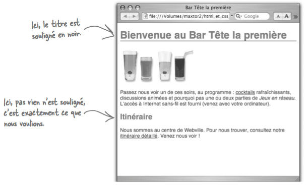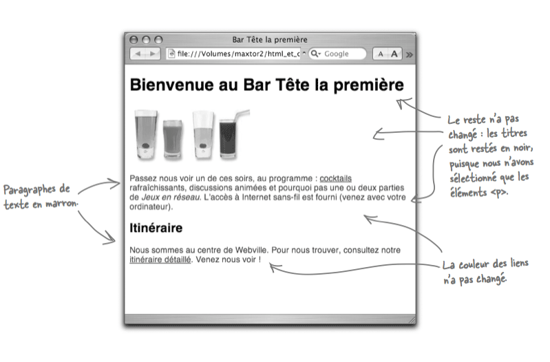 Enregistrez tous ces fichiers puis ouvrez bar.html dans un navigateur et cliquez sur les liens «cocktails» et «itinéraire»: il suffit de changer une seule ligne dans le XHTML de ces pages pour unifier leur style !