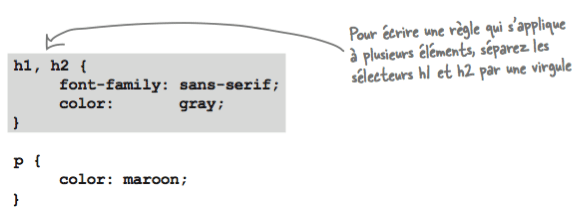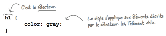 Quelque soit le mode d'insertion choisi, une feuille de style CSS est une suite de règles. Chaque règle consiste en un sélecteur, une propriété pour ce sélecteur et une valeur pour le style à appliquer à cette propriété comme l'illustre l'exemple suivant: