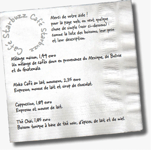 Pour y parvenir, commencez par ouvrir dans votre éditeur de texte, la liste des boissons que le PDG a écrit sur la serviette. Ces boissons constituent le contenu de votre page. Vous y ajouterez ensuite quelques balises HTML pour le structurer, mais pour le moment, ne tapez que le contenu de base. Tant que vous y êtes, ajoutez en haut de la page "Les boissons du Café Starbuzz".
