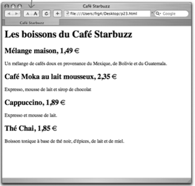 Starbuzz est une chaîne de Cafés connue pour sa croissance ultra rapide. La chaîne a d'ailleurs grandi si vite qu'elle n'a même pas eu le temps de mettre en place un site web. En achetant votre thé Chai chez Starbuzz, vous tombez par hasard sur le PDG qui vous demande de réaliser une page web ayant l'allure ci-contre