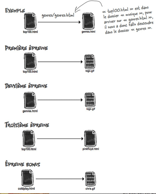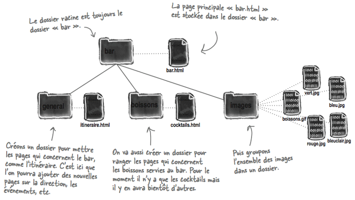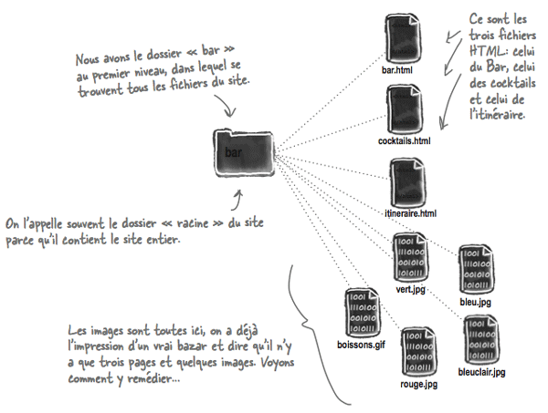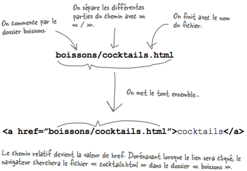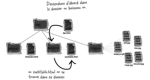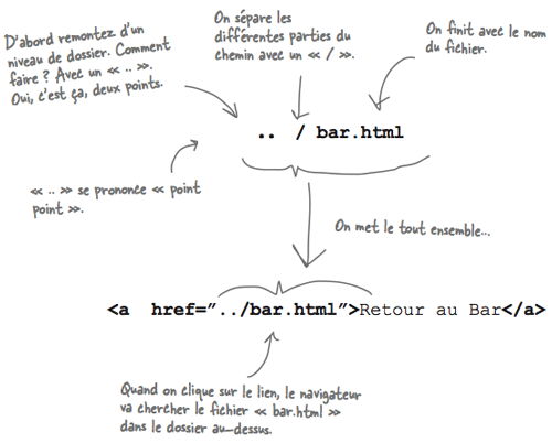 Jusqu'à présent, les valeurs de l'attribut href pointaient sur des fichiers situés dans le même dossier que celui dans lequel se trouvait le fichier «bar.html». Néanmoins, les sites sont généralement un peu plus complexes et il faut savoir faire pointer cet attribut vers des pages situées dans d'autres dossiers. Or, tracer le chemin d'accès à la page destination depuis la page en cours revient à descendre ou remonter d'un niveau ou deux de dossiers dans l'arborescence du site. Quel que soit le sens, le résultat obtenu est un chemin relatif par rapport à la page en cours que nous pouvons mettre comme valeur de l'attribut href.