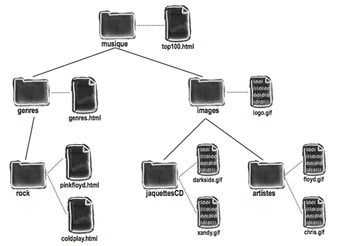 Avant de poursuivre la création de nouvelles pages HTML, pensez à organiser votre site. Jusqu'à présent, nous avons mis tous les fichiers HTML et les images dans un seul et même dossier. Vous vous rendrez compte que même pour un site de taille modeste, il convient de stocker les pages, les images et autres ressources dans plusieurs dossiers. Aussi, dans un premier temps, nous aimerions que vous créiez la structure de dossiers et de fichiers telle qu'expliquée par l'image de droite ci-dessous: