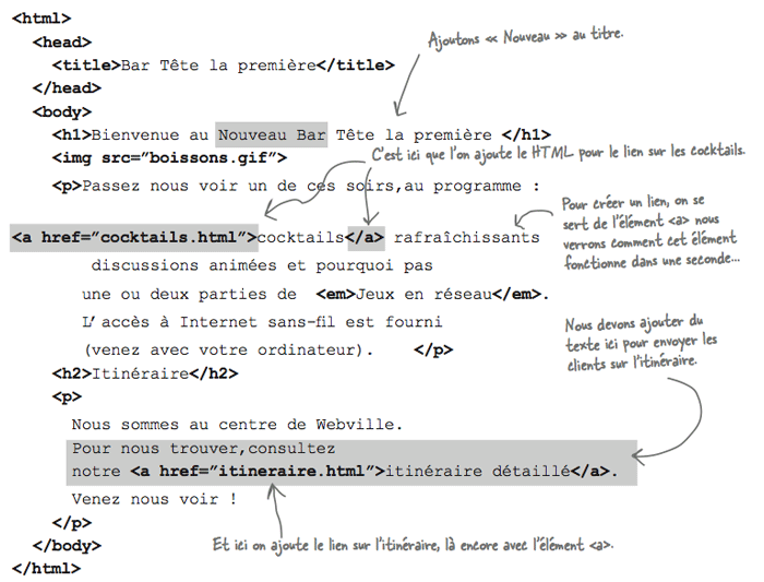 Le dossier «bar» situé dans le répertoire «bar-starbuzz.zip» que vous venez de télécharger contient les fichiers «bar.html», «cocktails.html», «itineraire.html» ainsi que quelques images. Ouvrez le fichier «bar.html» dans votre éditeur et faites les modifications qui sont surlignées ci-dessous. Une fois ces modifications effectuées, enregistrez le fichier, ouvrez-le dans votre navigateur et cliquez sur les différents liens présents. Vous devriez obtenir le résultat présenté sur l'image de droite ci-dessous: