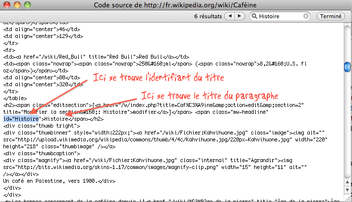 Pour créer l'ancre de destination d'un lien, il suffit d'inclure dans un élément <a> ou autre le texte sur lequel doit attérir le lien et de lui attribuer un identifiant à insérer comme valeur de l'attribut id situé dans l'élément. Par exemple, en parcourant le code HTML de la page http://fr.wikipedia.org/wiki/Caféine, nous remarquons que l'ancre de destination du paragraphe Histoire s'appelle également «Histoire».
