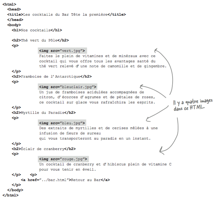 Comme nous pouvons le constater avec l'exemple ci-dessus, l'élément <img> est un élément vide, c'est-à-dire une balise dépourvue de contenu. Dès lors, plutôt que d'écrire <img src="images/boissons.gif"></img>, nous utilisons plutôt l'abréviation <img src="images/boissons.gif">. Cette abréviation est pratique dans la mesure où elle diminue la quantité de balisage dans le HTML.