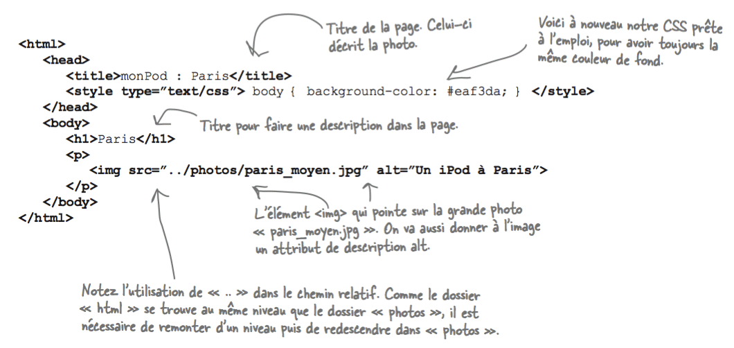 Transformez chaque vignette de la fenêtre principale en un lien vers une page qui contient l'image située dans le dossier «photos» et correspondant à la vignette. Chaque page liée aura le même nom que l'image à laquelle elle correspond et sera enregistrée dans un nouveau dossier intitulé «html». Chaque page contiendra uniquement un titre décrivant la ville dans laquelle la photo a été prise ainsi que la photo elle-même: