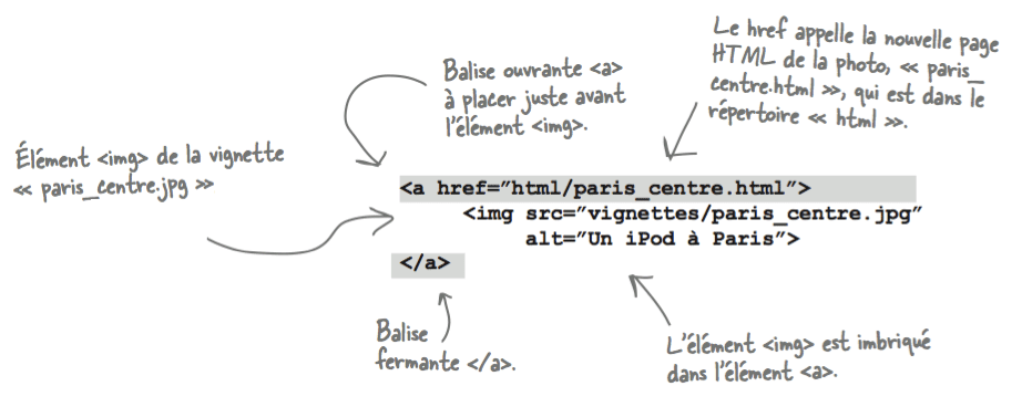 Pour faire un lien sur une image, il suffit d'imbriquer l'élément <img> dans un élément <a>. Le navigateur considère alors que l'image est cliquable et, lors de chaque clic, il va chercher la page indiquée dans l'attribut href de l'élément >a<. Notons que la plupart des navigateurs insèrent un encadré autour de l'image afin de montrer à l'utilisateur que celle-ci est cliquable. Si vous n'appréciez pas cette apparence, vous pourrez la modifier bientôt grâce aux feuilles de style CSS.