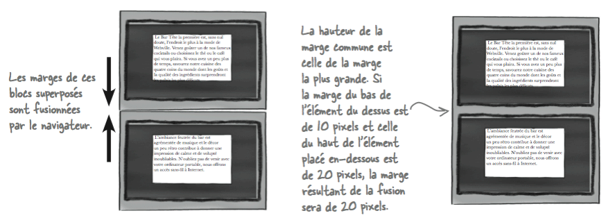 Quand le navigateur place côte à côte des éléments en-ligne ayant chacun une marge, il met suffisamment d'espace entre les deux pour que les deux marges soient prises en compte. Par contre, lorsque le navigateur place deux éléments de bloc l'un au-dessus de l'autre, il fusionne leurs marges communes. La hauteur de la marge après fusion est celle de la marge la plus importante.