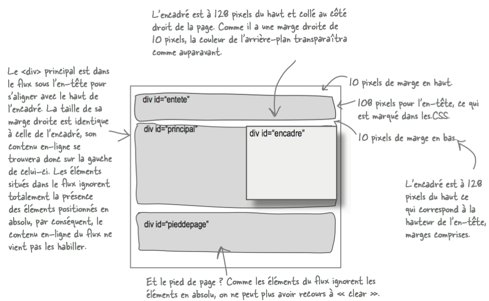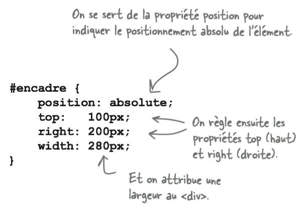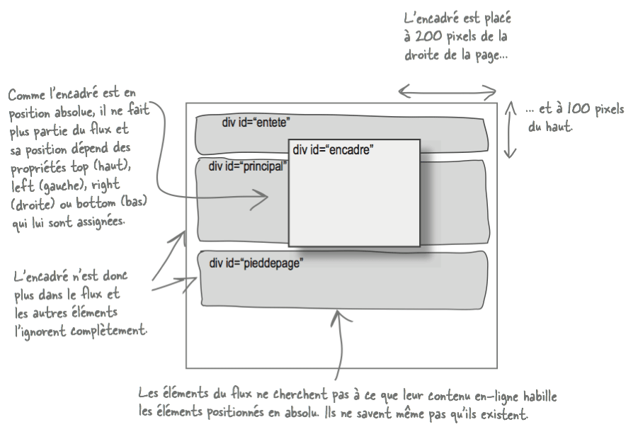 Quand un élément est positionné en absolu, le navigateur le retire du flux. Il le place en fonction des valeurs qui sont attribuées aux propriétés top et right (ou bottom et left). Dans notre cas, l'encadré se trouvera à 100 pixels du haut de la page et à 200 pixels de son côté droit. Les éléments, qui sont en-dessous, pourvu qu'ils soient dans le flux, ignorent les éléments empilés au-dessus d'eux qui sont régis, eux, par un positionnement absolu. C'est la différence avec les éléments flottants dont les limites sont respectées par le contenu en-ligne des éléments dans le flux. Les éléments absolu n'ont aucun impact sur les autres éléments.