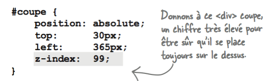 A ce dessein, nous allons faire appel au positionnement absolu que vous connaissez. Nous commençons par ajouter un <div> sous l'en-tête puis lui associons une règle de style. Afin d'être sûr que le <div> encadre ne passe pas par-dessus l'image de la coupe, il est possible d'utiliser la propriété z-index. Cette dernière indique le niveau d'empilement de l'élément associé.