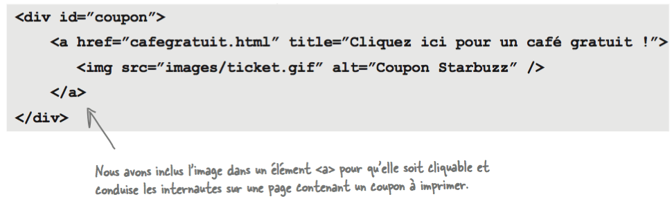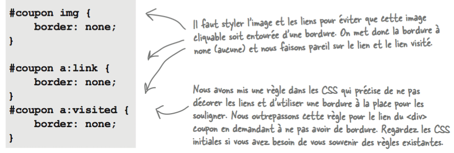 Une fois la règle de style établie, il ne reste qu'à placer l'élément coupon au bas du fichier index.html. Comme il va être positionné, son emplacement dans le XHTML n'aura de conséquence que pour les navigateurs qui ne supportent pas cette fonctionnalité et ce coupon ne mérite pas d'être en haut. De plus, afin d'éviter que l'image cliquable soit entourée d'une bordure, il convient de la styler: