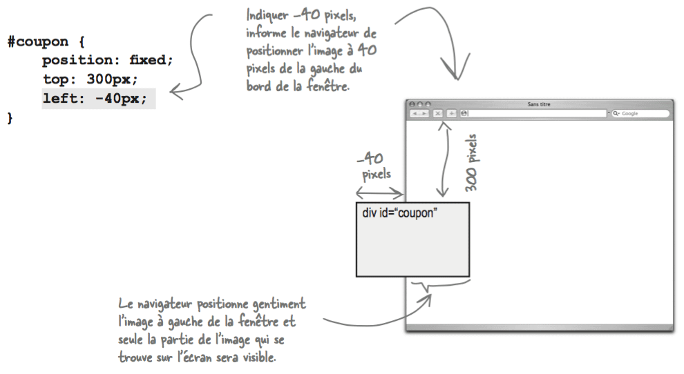 Comparé au positionnement absolu, le positionnement fixe est assez simple: il permet de déterminer la position d'un élément par rapport à la fenêtre du navigateur et non par rapport à la page. Par conséquent, le contenu fixe restera toujours à la place que vous lui avez assignée et n'en bougera plus même lorsque l'utilisateur fera défiler la page. Prenons donc l'exemple d'un <div> dont l'id est coupon et positionnons-le à 300 pixels du haut de la zone de visualisation et à 100 pixels du côté gauche: