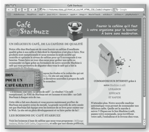 Testez la nouvelle version du site. Réduisez la taille du navigateur pour voir que le coupon reste toujours à la même place quand vous faites défiler la page. Cliquer sur le coupon vous redirige sur la page cafegratuit.html que vous pouvez construire si le coeur vous en dit.
