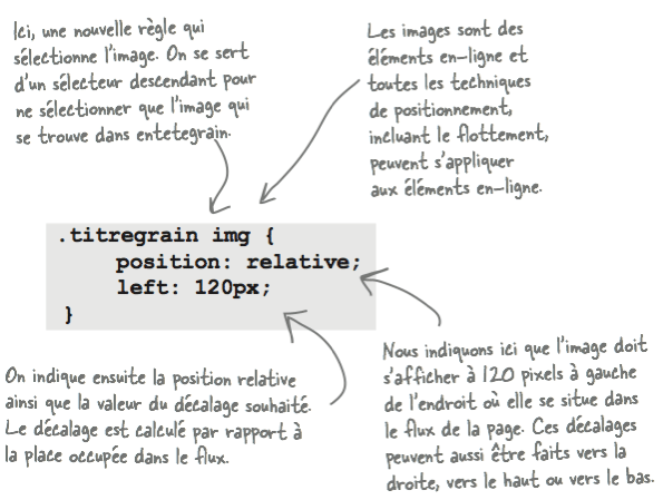 Comme toutes les techniques de positionnement peuvent s'appliquer aux éléments en-ligne, il est possible de les utiliser sur des images. Définissons donc une règle de positionnement relatif pour l'image située dans le paragraphe titregrain. Après avoir rechargé la page Starbuzz, vous verrez le paquet de café sur la droite de l'encadré. Le positionnement relatif s'exprime en terme de décalage par rapport au véritable emplacement de l'élément et non avec des coordonnées absolues par rapport au bloc conteneur le plus proche.