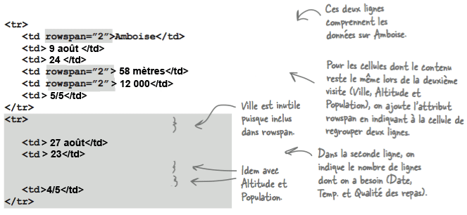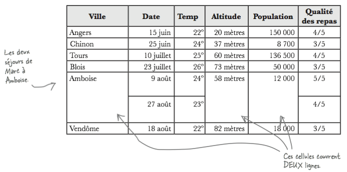 Notons qu'il est également possible de fusionner des cellules par colonne à l'aide de l'attribut colspan. Dans ce cas, on enlève des cellules de la même ligne.