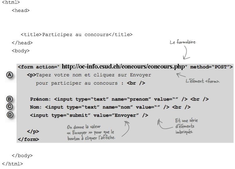 L'élément <form> contient tous les éléments de construction du formulaire et indique au navigateur où envoyer les données et quelle méthode employer pour le faire: